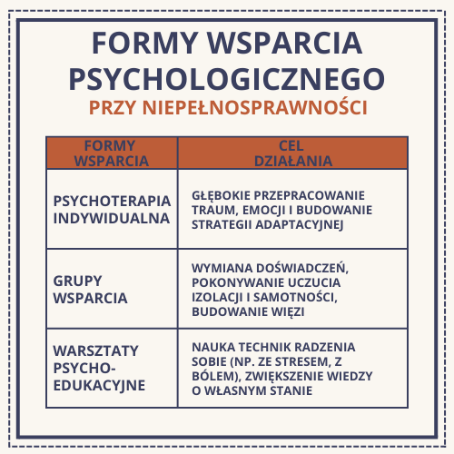 W zależności od indywidualnych potrzeb i etapu adaptacji, wsparcie psychologiczne może przybierać różne formy dostosowanych do pacjenta: